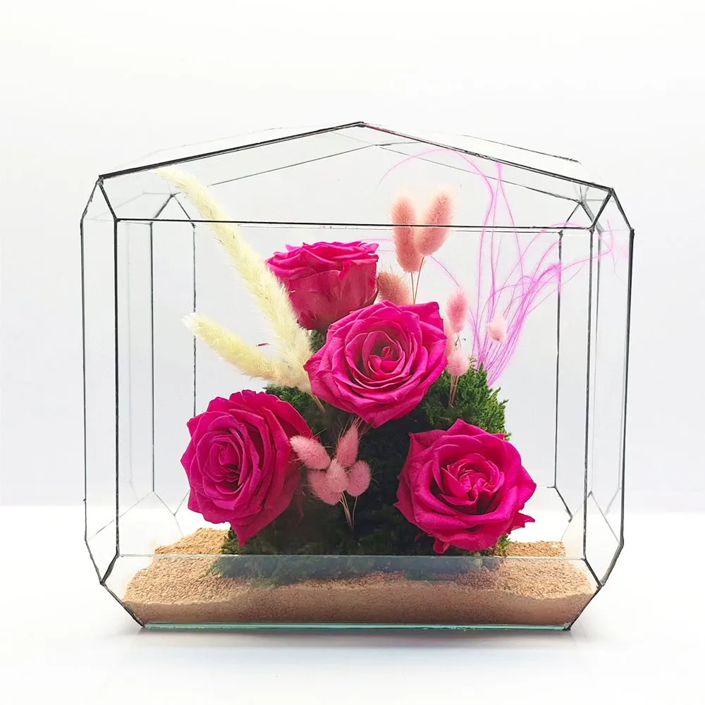 این باکس شیشهای هندسی، حاوی ترکیب منحصربهفردی از رزهای جاودان تولید اختصاصی مجموعه والا رز است؛ گلهایی که با روشهای حرفهای و کاملاً طبیعی تثبیت شدهاند تا سالها بدون نیاز به آب و نور، شاداب و زیبا باقی بمانند.